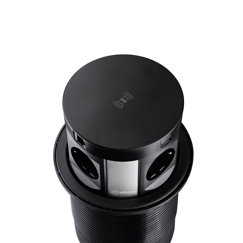 В неактивном состоянии выдвижная розетка будет скрыта от ваших глаз. Как только она вам потребуется, нажмите на крышку, блок активируется автоматически. Для деактивации следует нажать на крышку и опустить корпус до упора. Для зарядки мобильных устройств, поддерживающих стандарт беспроводной зарядки Qi, расположите устройство посередине крышки.